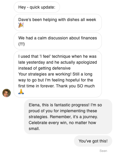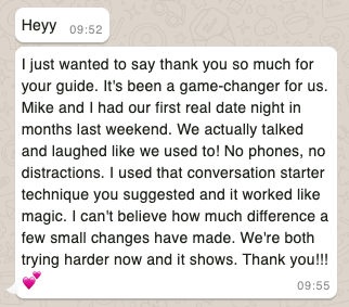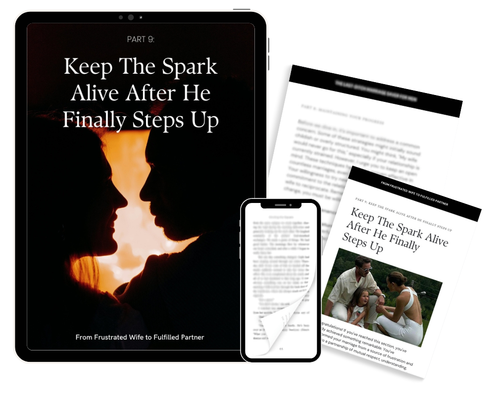 My husband and I were constantly fighting and I felt like I was doing everything around the house. I was so resentful. After implementing the strategies from this guide, my husband has really stepped up. He's more attentive, helps out more, and we're finally connecting again. I feel so much happier and optimistic about our marriage now. Thank you!